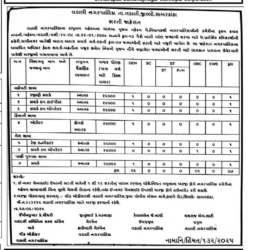 मुख्य जानकारियाँ – Vadali Nagarpalika Recruitment 2025